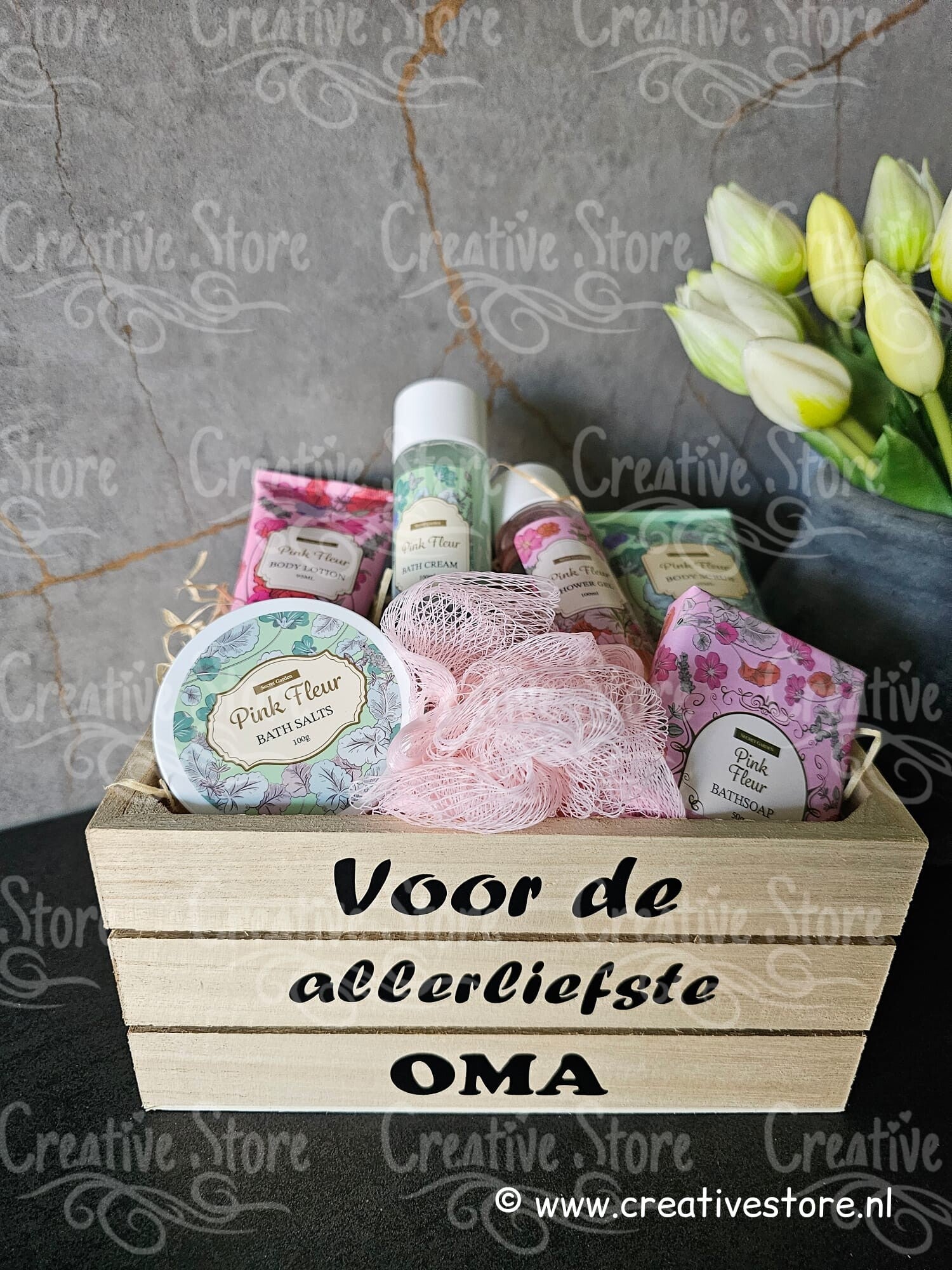 De giftset bevat onder meer douchegel, bodylotion, badcrème en puff