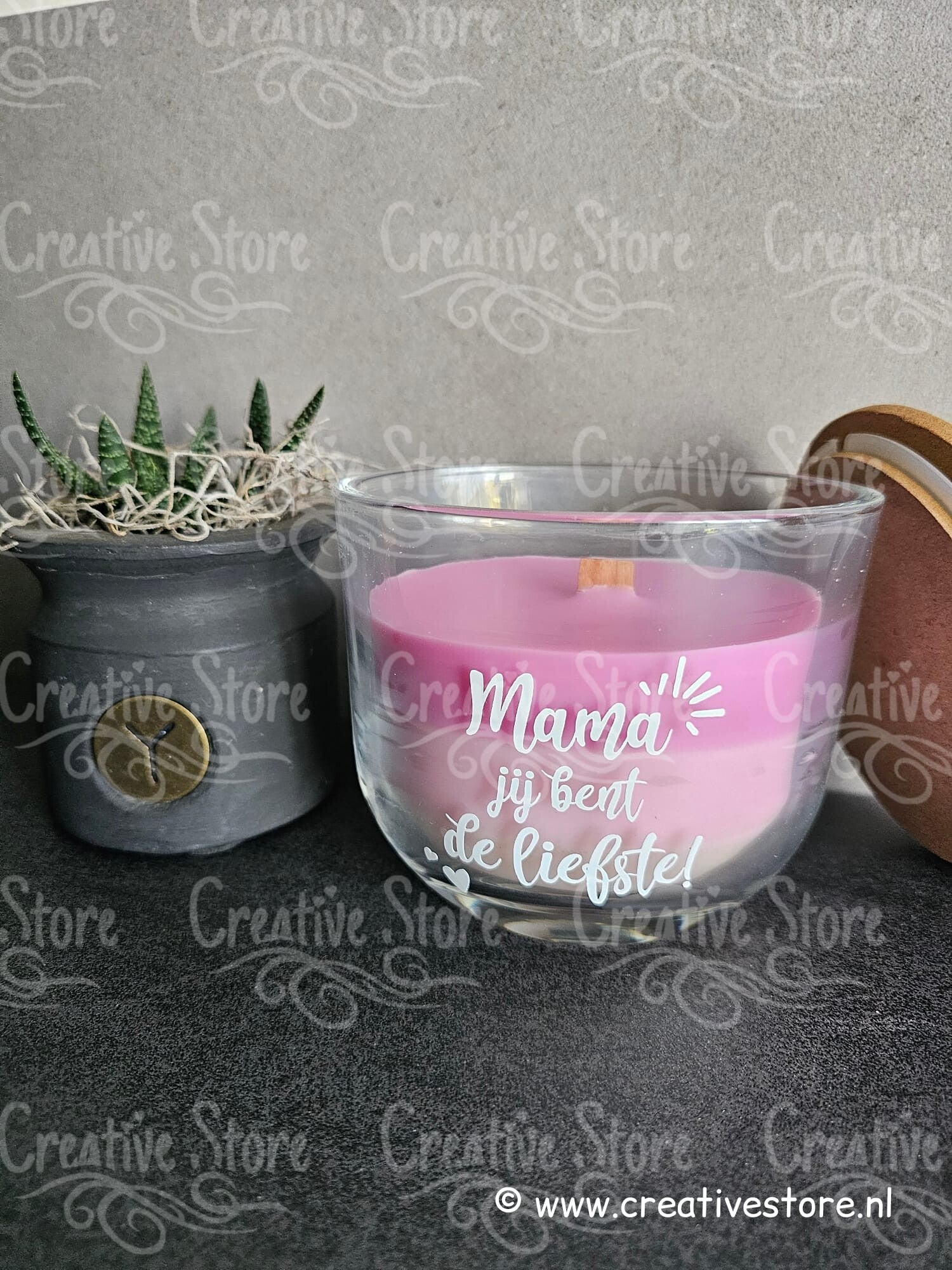 Geurkaars in glazen pot met houten deksel met opdruk Mama jij bent de liefste!
