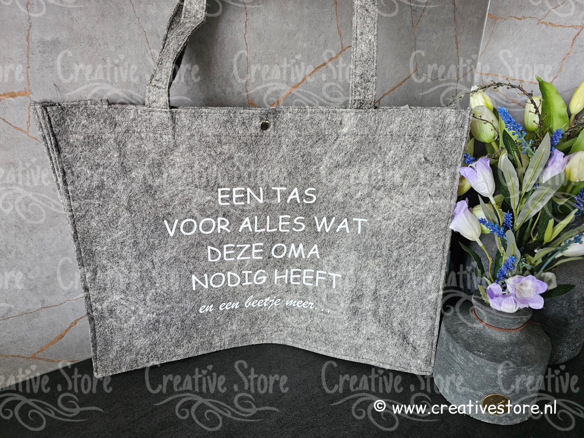 Vilttas met opdruk een tas voor alles wat deze oma nodig heeft en een beetje meer...